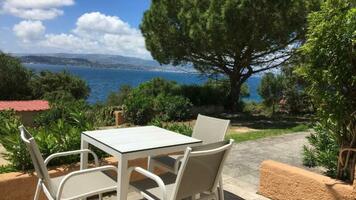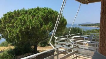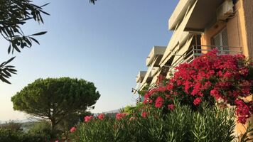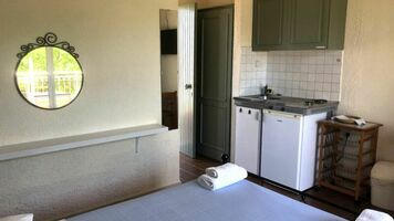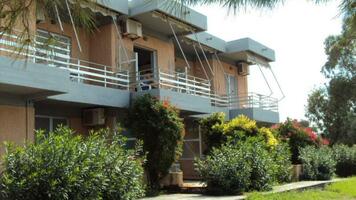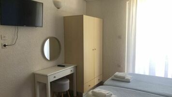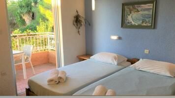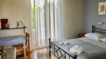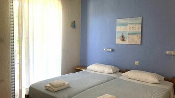 2 ágyas oldal tengerre néző stúdió: egyszerűen berendezett, kényelmes, egy légterű helyiség, konyhasarokkal, légkondícionáló, hűtő, TV, zuhany, balkon/terasz. A stúdiók földszinti és emeleti elhelyezkedésűek is lehetnek.