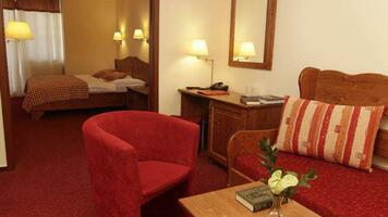 2+2 fős lux lakosztály (a melléképületben): tágas, igényesen berendezett, kétszintes apartman 2 fős hálószobával a nappaliban 2 pótággyal, saját fürdőszoba köntössel és wc-vel. A szobákhoz műholdas tv, telefon, minibár, széf és hajszárító tartozik. Min. 2 főre foglalható és teljes áron fizetendő. Kb.: 36 m2.