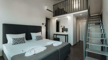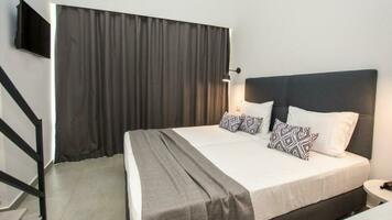 2+2 fős maisonette szobákban: Kényelmesen berendezett"Maisonette" típusú szobák, amelyek 4 fő elhelyezésére alkalmasak, 1 légteresek, 35 nm alapterületűek, galériával rendelkeznek (2 db ággyal a földszinten és 2 fős szofa ággyal az emeleten), TV, telefon, légkondícionáló, széf, wifi, minihűtő, vízforraló, hajszárító, zuhanyzós fürdőszoba valamint balkon/terasz. A szobák oldalról tengerre nézőek.