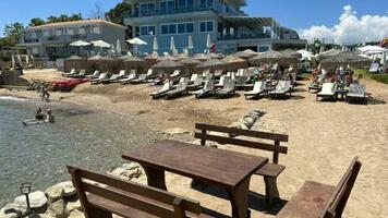 Strand: közvetlenül a kavicsos, sziklás valamint homokos partszakaszon.