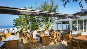 Strand: 50 m-re, sziklás, betonos és kavicsos strand, napágyak és napernyők bérelhetők.