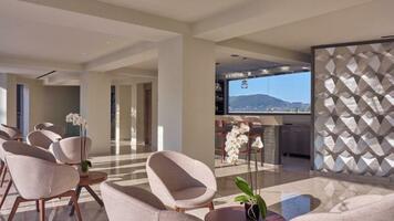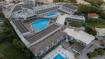 A családi üzemeltetésű, 12.000 nm alapterületen elhelyezkedésű modern Hotel Agios Sostis csendesebb övezetében, a sziget egyik legszebb településében található. A környéken számos barlang, szikla és píneaerdő ejti ámulatba a látogatót. A 7 különálló épületből álló, 150 szobás szálloda egy kis domboldalban, az öböl felett fekszik ezzel is biztosítva a lélegzetelállító panorámát. A Resort Agios Sostis öble felett található, kb. 80 m-re a homokos strandtól (lépcsőkön keresztül közelíthető meg). A település központja mindössze kb. 300 m-re, Laganas üdülő központja b. 2 km-re található. A transzferbusz nem tud parkolni a szálloda előtt, csak kb. 70 m-re (nincs megfordulási lehetőség). A menetrend szerinti busz megállója kb. 300 m-re.