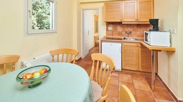 2 fős teraszos stúdió apartmanok: 24 m2-es, légkondicionált, egy légtérben franciaággyal, konyhával, nappalival és kádas fürdőszobával rendelkező, földszinti vagy 1. emeleti, teraszos apartmanok.
