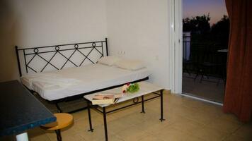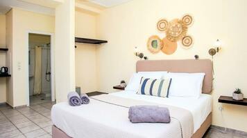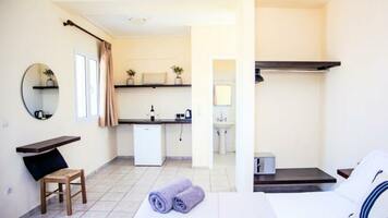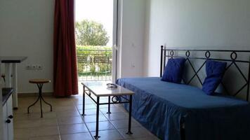 2 ágyas standard szoba: 30 nm alapterületű, főépületi elhelyezkedésű egyszerűen berendezett egylégterü helység, Flat TV, légkondícionáló, kisméretű hűtőszekrény, vízmelegítő (tea és kávé fogyasztási lehetőség), WIFI, fürdőszoba, hajszárító, széf, balkon/terasz. A stúdiók, szobák nem rendelkeznek konyhasarokkal.